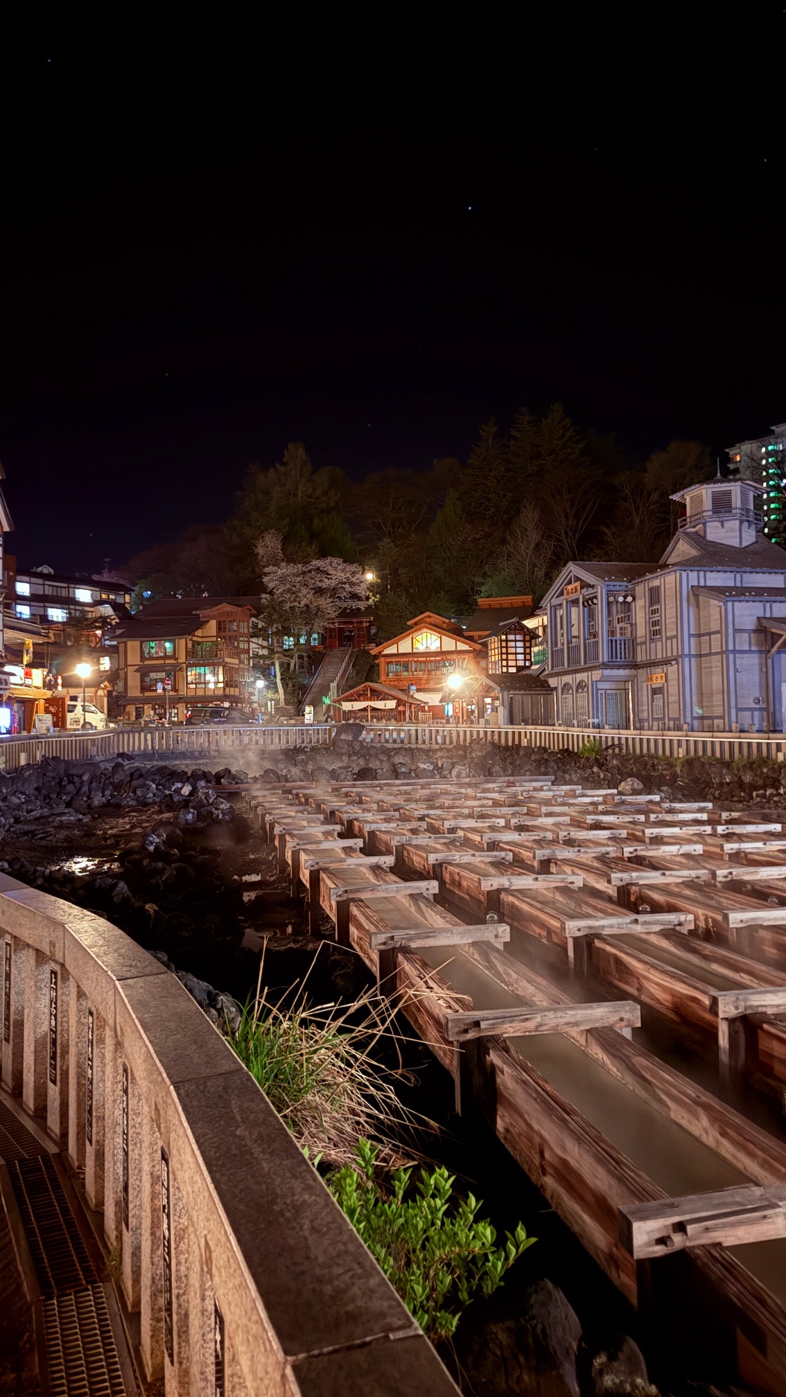 夜に到着したのですが人けのない湯畑を散歩しながら足湯に浸かり、